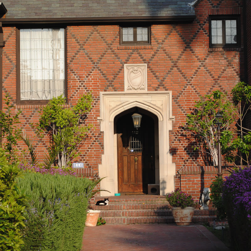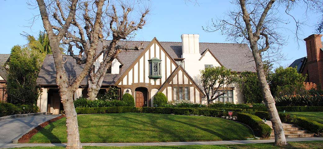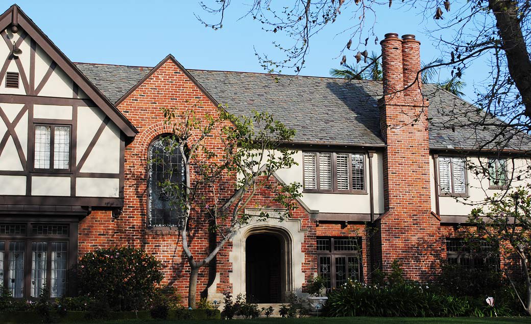 Tudor houses are very charming and picturesque, so naturally they have always appealed to the “dream makers” of Tinseltown. The signature characteristic of houses in this style is the prominent front facing gable. There are usually steeply pitched roofs of slate or wood shingles, half-timbering of dark or painted wood and stucco, but also sometimes in-filled with herringbone or basket-weave brickwork, stone accents, tall mullioned windows of leaded glass in various patterns, high multi-flue chimneys, jettied (overhanging) second floors, dormer windows, and oriole windows supported by consoles.